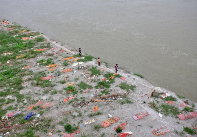 인도 북부 갠지스강변에 시신 40구 이상이 발견됐다. 갠지스강 유역에는 바라나시를 비롯하여 하르드와르알라하바드 등 수많은 힌두교 성지가 있다. 저 멀리 화장터에서 연기가 피어오른다.