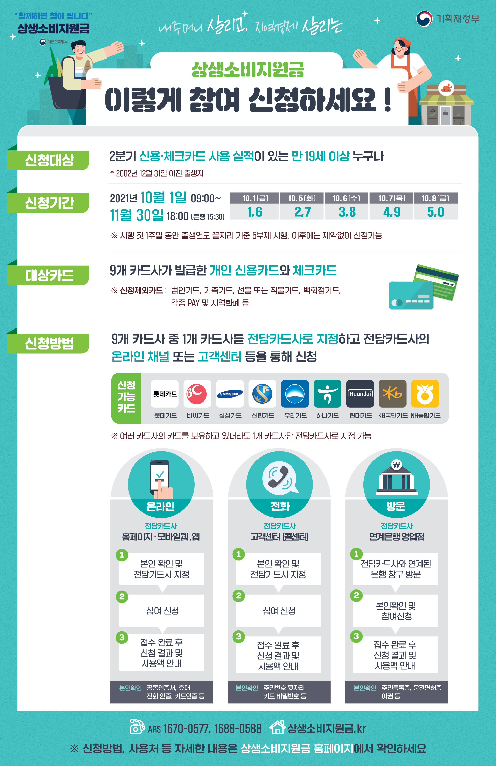 2021101금부터 2개월 간 시행. 월 카드사용액 1011월에 대해 10를. 상생 소비지원금 신청 방법 은 롯데카드 비씨카드 삼성카드 신한카드 우리카드 하나카드 현대카드 kb국민카드 nh농협 카드 등 9개 카드사 중 한곳을 전담카드사로 지정해 신청하면 된다고 합니다.